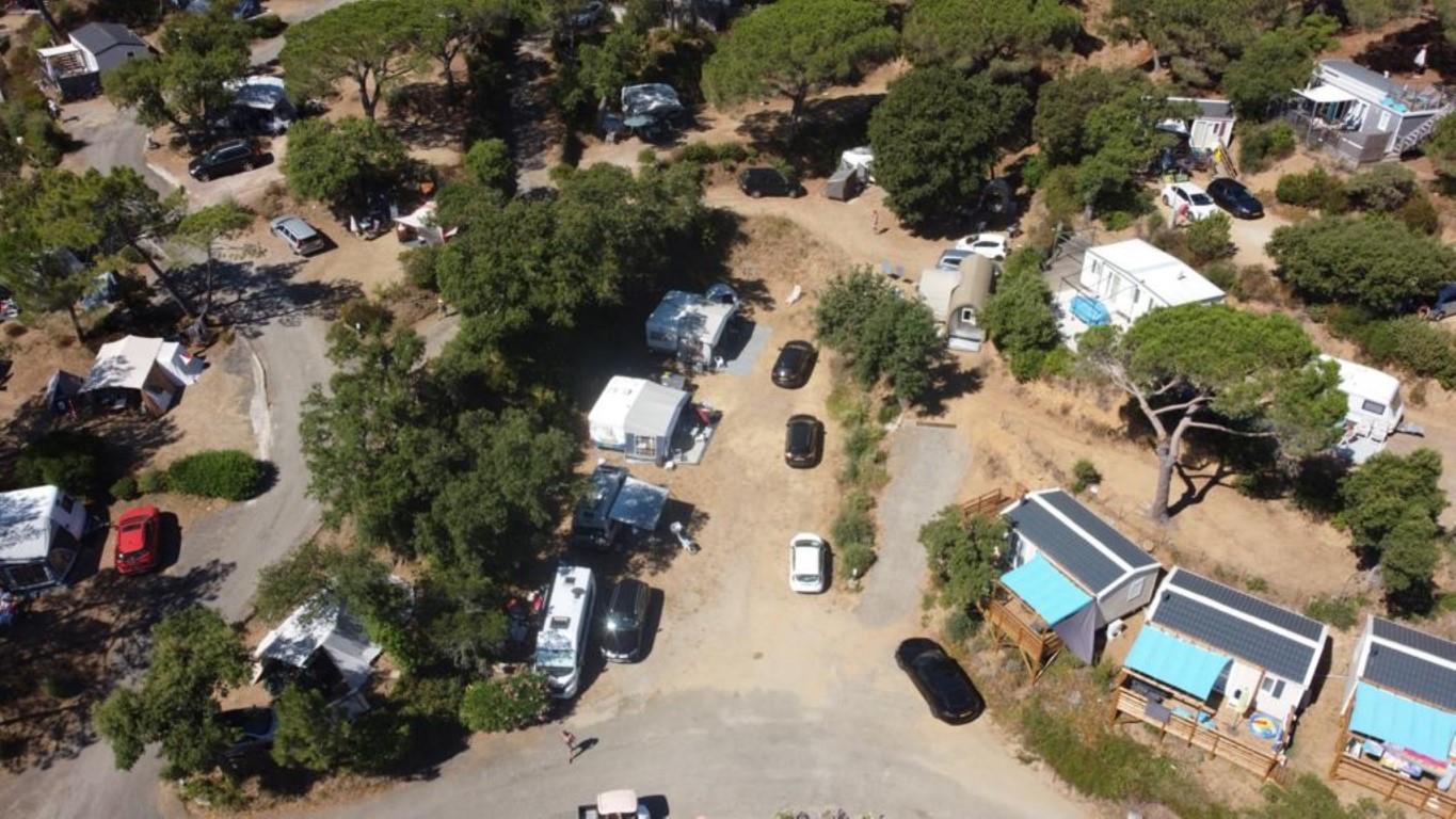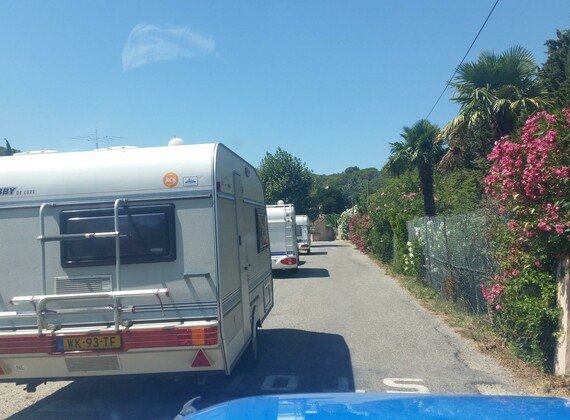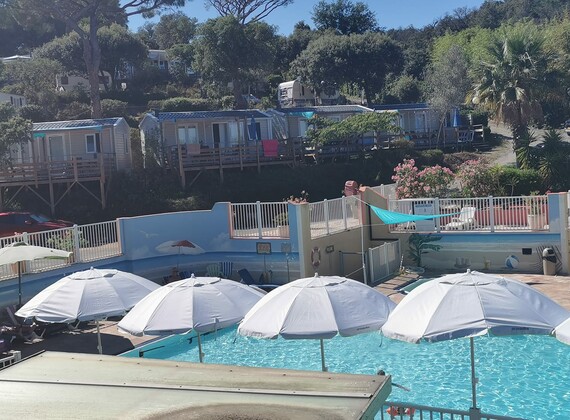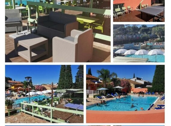The campsite – under Dutch management – has all together 80 pitches, 49 for caravans and tents, 19 pitches with rental static caravans and 6 with rental lodge tents, on approx. 5 acres total surface. A relatively small site without loud disco noises and annoying din of animation ,at a fair distance situated off the main road.A considerable number of the luxurious rental accommodations and pitches for caravans is on hidden terraces against wooded hill slopes, offering a magnificent view towards the Mediterranean Sea and the Esterel Mountains. Hiker trails in the Petits Maures range of hills start directly behind the campsite grounds. You may join organised hiking tours (not during high season) to the imposing mass of rocks of nearby Roquebrune.